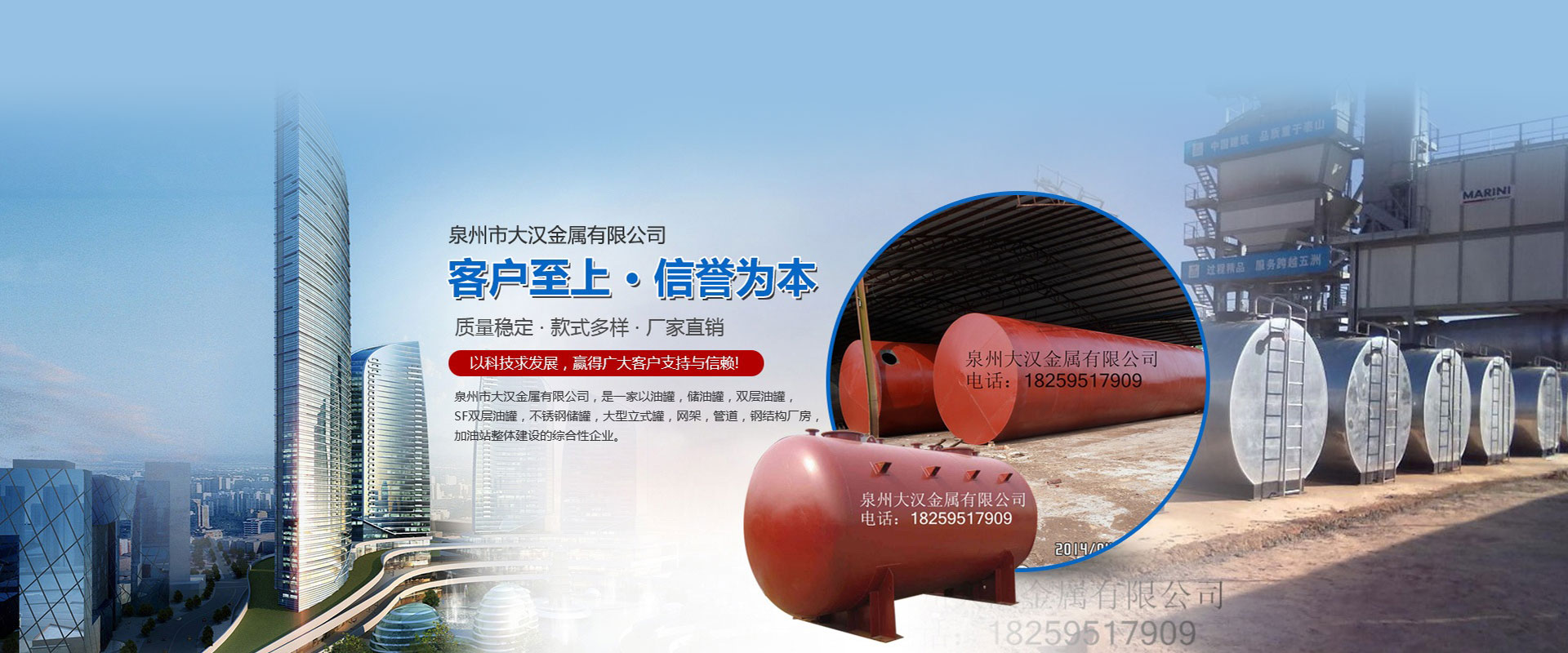 泉州市大漢金屬有限公司,是一家以油罐、儲(chǔ)油罐、雙層油罐、SF雙層油罐、不銹鋼儲(chǔ)罐、大型立式罐、網(wǎng)架、管道、鋼結(jié)構(gòu)廠房、加油站整體建設(shè)的綜合性企業(yè)。本公司以技術(shù)人員、施工經(jīng)驗(yàn)豐富的工程隊(duì)、自動(dòng)化設(shè)備、擁有鋼結(jié)構(gòu)建筑、螺栓球網(wǎng)架設(shè)計(jì)安裝技術(shù)力量,嚴(yán)格按照國(guó)家容器標(biāo)準(zhǔn)制造,是一家產(chǎn)品開(kāi)發(fā)并生產(chǎn)各種壓力容器和制造金屬結(jié)構(gòu)工程,化工石油工程安裝的大型企業(yè)。近多年來(lái),以質(zhì)量穩(wěn)定、客戶至上、信譽(yù)為本,以科技求發(fā)展,贏得廣大客戶支持與信賴。